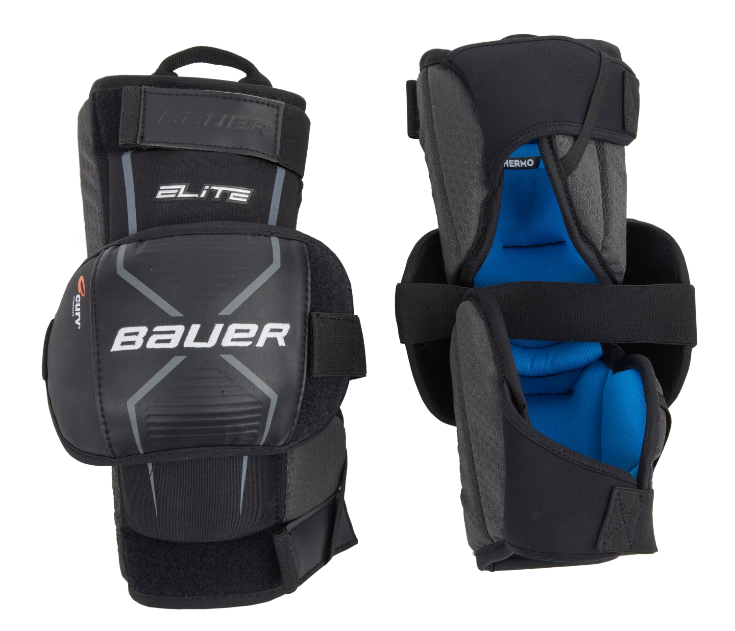 Feel safe and in control with the new Bauer ELITE knee pads. Built with durable nylon and leather overlays in the high wear areas, three Velcro straps for stability, thermo core liner and Curv composite outer guard lined with Poron for comfort and impact protection. The same features as the PRO model but in a bigger and bulkier version.